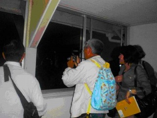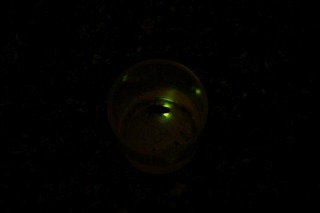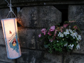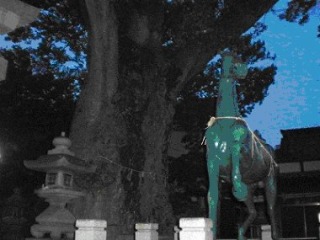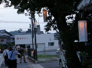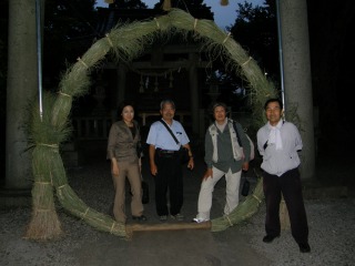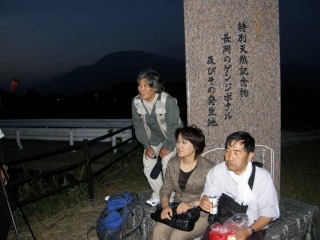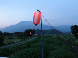 金山を17時55分発の帰宅ラツシューの快速列車に乗り近江長岡に向かう。列車が大垣駅を過ぎローカル色豊かな里山と田んぼが広がる風景になり、ホタルが見れるぞと言う気持ちになり車窓の景色を見ながら童心に帰った。18時58分列車は定刻どうり無人駅の長岡に着く、キップを回収ボックスに入れ夕闇には少し早い駅前の路地に向かう。迎えてくれたのは地元の子供から大人がそれぞれに故郷の誇りホタルへの思いを絵に描いた掛行灯であつた。町民のホタルに対する想いを描いたぼんぼりに導かれて、路地を進むと天野川の下流に着く。程なく歩くと町の社である川の脇に鎮座する長岡神社があり参拝する。この社には今回のホタル祭りに(6月5日〜14日)に合わせて神事が行われたらしく、萱で作られたチワワ?の輪があり、その横には樹齢800年、滋賀県天然記念物のイチョウの大木が四方を見渡していた。社を後に夕闇が迫る川沿いの路をぼんぼりに導かれ歩み、ホタル観賞地のシンボル特別天然記念物の謂れと発祥を記したレリーフの石碑の前に座り込み、軽い軽食と歓談をしながら暗闇になるまで時を過ごしホタル出現を待つ。少し風も出てきてホタルが飛び交う気配はないものの川辺の草むらに1つ、2つとホタルの明かりを観賞出来た。どうやらピークは過ぎたらしく数は多く出現しなかったが童心帰りそれなりに達成感を味わう事ができた。このまま自然破壊が進まず、伊吹山の麓の里山に自然豊かな環境が育つことを祈念しながら、帰路に着く。  帰りの列車を待つホームでは待合室の明かり等ガラスに集うカゲロウは始め多くの虫たちを観察する会員の好奇心と姿勢は相変わらず頼もしいものであつた。(記・南川)