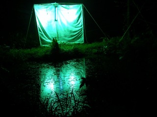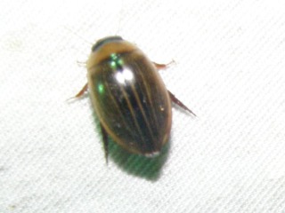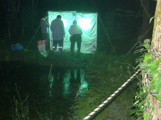 今回の観察は知多半島のため池の水生昆虫特にゲンゴロウ類の現状把握を目的に実施しました。知多半島では過去の調査で22種類のゲンゴロウが記録されていて(愛知県の昆虫)、その大部分が美浜町の記録です。観察池として里山池を選んだ理由は美浜町にあり、外来魚がおらず、水草が豊富でゲンゴロウの生息に適していると思われたからです。たくさんの種類が見られることを期待して家を出ました。19:00過ぎに到着、降幡さんと池のすぐそばに灯火装置をセットして虫が集まるまで2人でナイトハイクに出かけました。出かけてすぐ浅井さんと沖田さんがやってきて仲間に加わり、4人で林道を300mほど散策しました。雨上がりの好条件に恵まれ、真っ暗闇にたくさんのクロマドボタルの幼虫が黄緑色の淡い光で我々を迎えてくれ、幻想的な光のショウにしばし見とれました。虫の音を聞きながら散策を終え20:30過ぎに灯火場所に戻りました。灯火に来たのは羽アリ、ユスリカ、ヨコバイなど細かい虫ばかり、大型の虫が少なく、ウスバカミキリだけが目立ちました。目的のゲンゴロウ類は21:00頃にやっと1匹、結局21:30近くまで粘って、わずか2匹来ただけ、少なくとも5種類は見られると予想していたのでがっかりです。時期や灯火条件が悪かったのか、灯火に来る種類が少ないのか、里山池ができて日が浅く、十分ゲンゴロウ類が居ついていないのか、理由はいろいろ考えられますが、知多半島のゲンゴロウ類が急速に減っているからではないでしょうか。事実、日本各地で水生昆虫の減少が著しく、埋め立て、護岸、農薬、水質汚染、外来魚などが主な原因だそうです。知多半島で減少しているとすれば最大の原因は外来魚の繁殖によると私は思っています。自己満足のため外来魚を放流する心無き行為に怒りを覚えます。今後も実情把握のため、各地のため池で灯火観察を続けていこうと思います。(記・平松俊)