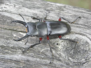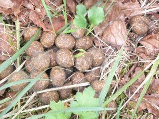 【左】丸いからノウサギの糞?。鹿が来たらスズダケが食べられる。  【右】ブナ林に住むアカアシクワガタが遊歩道の手すりに