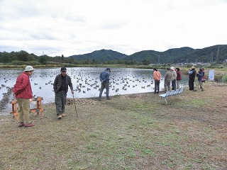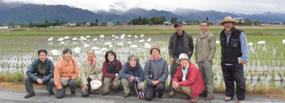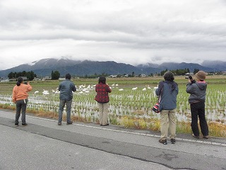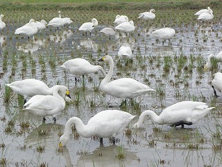 Aオオハクチョウを観察:本来いるはずの犀川にはおらず、近くの餌場となる水田で群れを観察しました。まだ、渡ってきたばかりのハクチョウは、人を警戒することも少ないようでかなり近づくことができました。