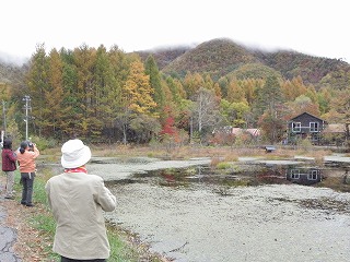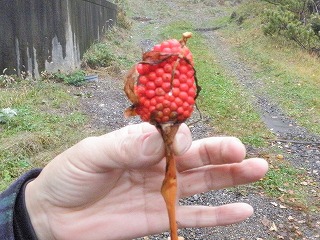 @早朝散策:朝、民宿の周りの自然を観察しました。様々な実やキノコなどに出会いました。また、温泉の湧き出したところもあり湯の花ができていたり、池が白くなっている幻想的な風景を目にすることもできました。