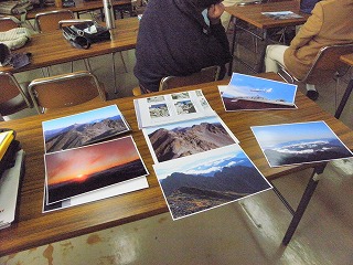 【左】聞き入る会員           【中】記録写真の紹介           【右】奥穂高岳の登山記録写真