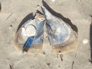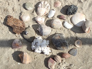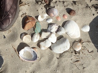 【左】貝の仲間、集合         【中】オオヘビガイなど       【右】白い石