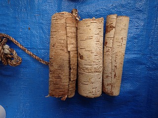 【左】シラカバの皮の浮き        【中】当日、制作されたモービル       【右】昼の豚汁は美味しかった