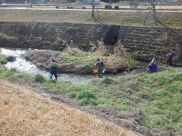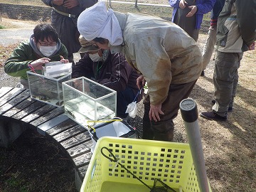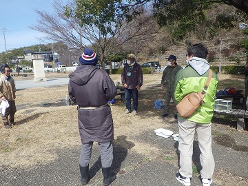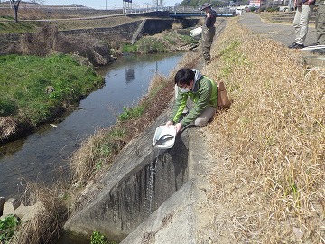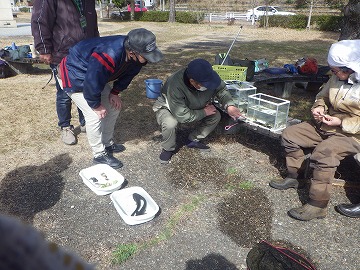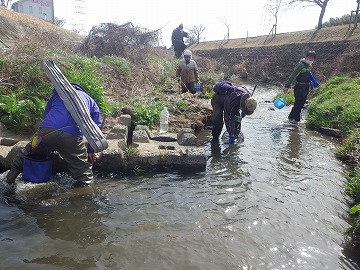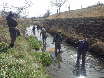 堤防上の小さな公園のベンチを本部にして、本部から100mほど下流から川に入り、そこから、各自、タモ網を使いながら上流に移動して本部前で終わりという方法で行いました。