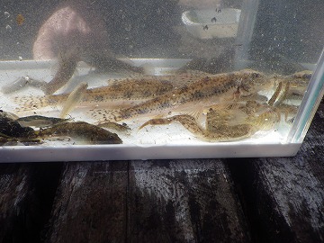 【左】漁方法は夏場と同じ   【右】本部で研修会。種名の確認。最手前は "ナマズ"のバット