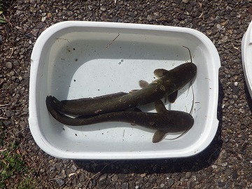 【左】日差しに誘われて出てきたのか…  【右】ナマズ。それぞれ、ウナギ用の筒に入っていた