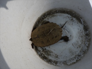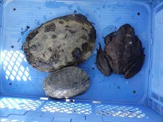 全く動かない冬眠中の大きなウシガエルやアカミミがメ、イシガメもいました。