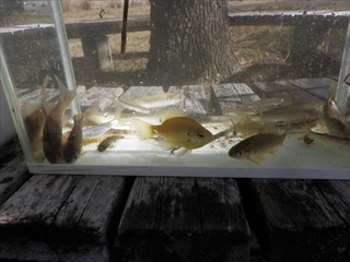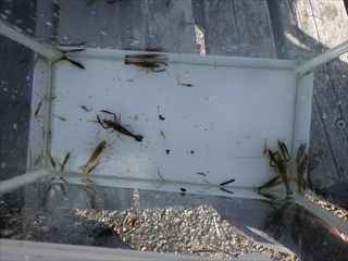 【左】川でつかまえた魚の水槽 【右】獲物の種類を確認中。モクズガニは無し