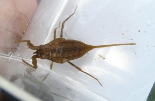 【左】水に入るのをちゅうちょしていた子も、最初に入った子が「気持ちいい」の一言で次々続いて入りました。【右】タイコウチ。お尻に有る棘みたいなもので呼吸をします。