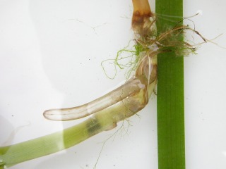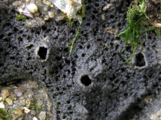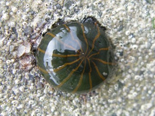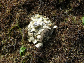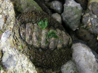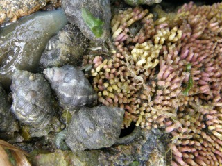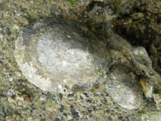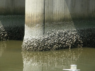 【左】コンクリートに帯状にフジツボとカキが付いていました。