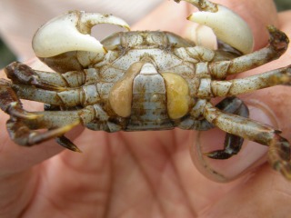 【中】ヒライソガニにウンモンフクロムシが寄生していました。