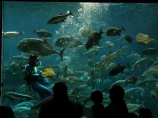 【左】生き物の生活について説明  【右】ビーチランド大水槽で魚の観察