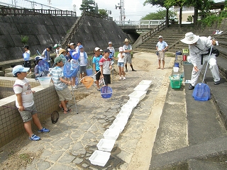 水質調査で分からない言葉があり少し緊張しましたが開放されると、子供たちは張り切って、魚やザリガニを追い求めていました。
