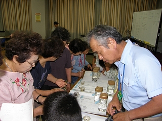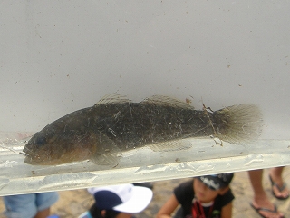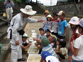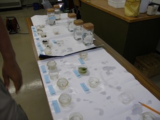 最近、水環境について感心が高まっています。環境省では水生生物の調査をして全国比較をするために、全国水生生物調査の実施をしています。今回は阿久比町環境課から水質を調べる薬品が入っているパックテストという物いただきました。これを使ってを使って川に入る前にみんなで調べてみました。水温は27度でした。水の酸性、アルカリ性を調べるテストではPH(ペーハー)は7位で中性でした。次にCOD(化学的酸素要求量)といって水に酸素がどのくらい溶け込んでいるかパックを使って調べました。反応した色は13位で少し汚れているみたいでした。パックテストをしてから全国水生生物調査の対象生物となっているものも観察してみました。