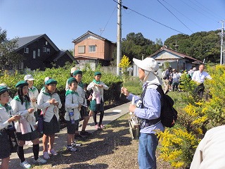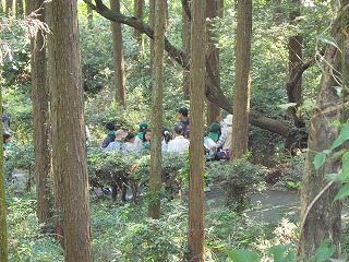ほとんどグル−プが椋岡の集落の中を観察しながら箭比神社に向かいました。箭比神社では、スダジイの純林を観察し、その木の根元に生えていたオオワライタケの束生を見つけ感激していました。また、ニホンミツバチが営巣しているのを見つけたグル−プもありました(記・降幡)
