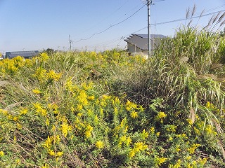 【左】セイタカアワダチソウの中にヨシが進入          【中】キンモクセイ          【右】箭比神社の御神木、アベマキ