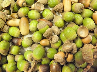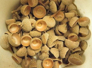 【左】コナラ、アラカシ            【中】アラカシ            【右】ドングリの帽子。殻斗(かくと)