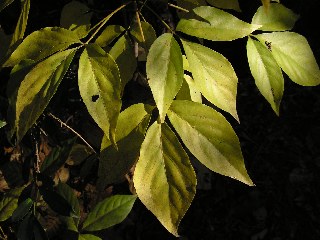 【右】タカノツメ別名イモノキ。どちらもウコギ科できれいな黄色になり、始めてみる人は見分けができません。
