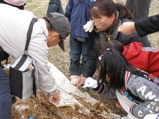 【左】出てきた虫を図鑑と比較し、確認しています。