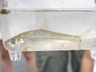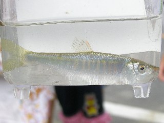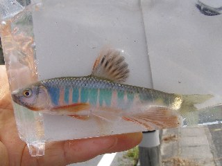 【左】オイカワのお父さん。結婚したい時にきれいな色になります。また、追星といって口の周りにざらざらが出ます。