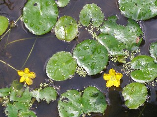 【中】水路の植物、アサザが少し遅い花をつけていました。