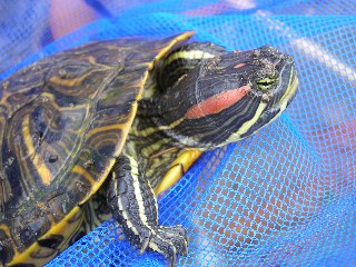 【左】アメリカ原産のミシシッピーアカミミガメです。特定外来生物にはなっていませんが在来のカメの生息に影響しているみたいです。