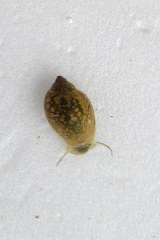 【右】水槽の清掃をしてくれるイシマキガイ。