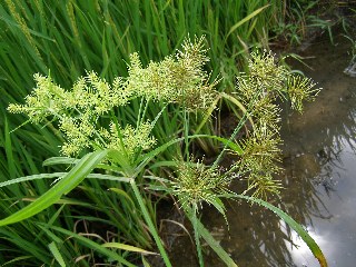 【中】水田付近の植物、外来のカヤツリグサ科のコガネガヤツリでしょうか。