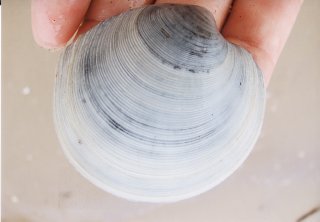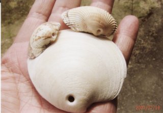 【右】カガミガイ。貝殻は厚くとても美しい形をしています。食用になります。