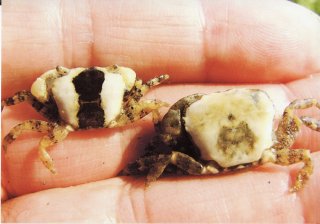 【中】ヒライソガニ。甲羅が平らでいろいろな色の個体が見られます。