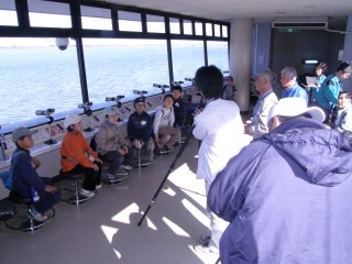 【左】名古屋市野鳥観察館のお兄さんから望遠鏡の使い方の説明を聞いています。【右】水鳥がたくさん見えました。