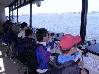 「知多っ子体験クラブ」の最終メニューとして、水辺の野鳥を理解するために名古屋市野鳥観察館に行きました。名古屋市野鳥観察館前の藤前干潟は、訪れたときは潮が満ちて干潟は現れていませんでした。それでもカモの仲間やカモメの仲間をたくさん見ることができました。