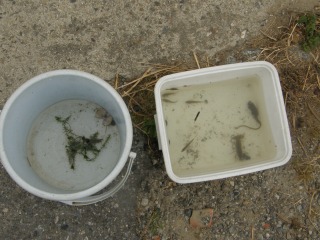【右】水路でヌマガエルとシジミを発見しました。