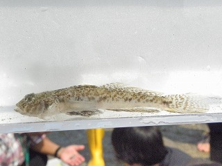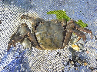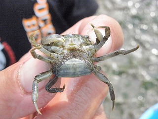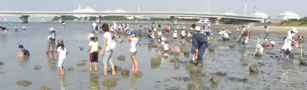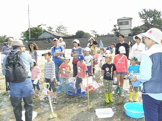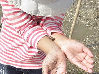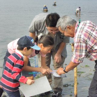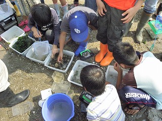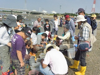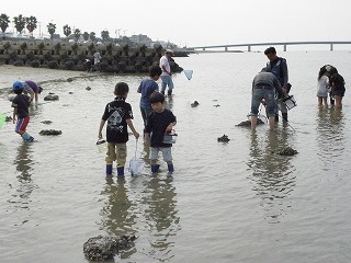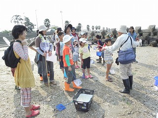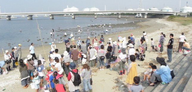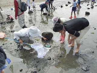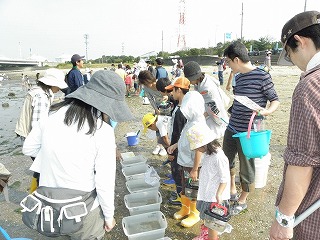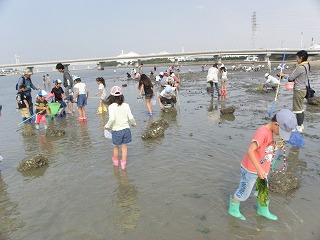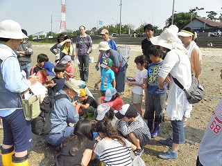 10時から6班に分かれて、たんけんを開始しました。各指導員の経験とアイディアを生かしたたんけんが始まりました。私の班はまず砂浜のコメツキガニの穴を探し、周りの砂団子を観察してから穴を掘り起こしてコメツキガニを採取しました。石の下やカキがらの下からケフサイソガニなどのカニを採取しました。ここの海水中にはアオサがいっぱいあったので魚をすくおうと試みましたがだめでした。海底はヘドロ状態で臭気がありました。干潟に移動してスコップで掘り起こしたところ、アサリが次々と見つかり大人も子供も大喜びでした。ハマグリや小さなマテガイも見つかりました。10時50分にはたんけんを止めてA(1,2班)B(3,4班)C(5,6班)のグループごとに採取した生きものを皆に紹介しました。持ち帰りはアサリだけとして、他の生きものは海に返して解散しました。最後に県民センターでアンケートを収集しました。(記・大野)