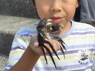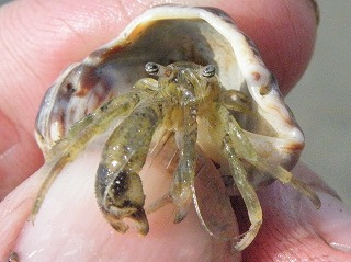 【左】ヤドカリさんくすぐったい 【中】モクズガニを捕ったよ 【右】波消しブロックにたくさん生き物が付いていました。