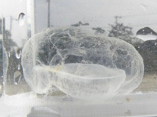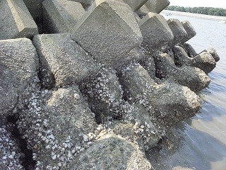 【左】波消しブロックに附着したカキ、ムラサキイガイ、フジツボ、タテジマイソギンチャクなど 【中】タテジマイソギンチャク 【右】19クラゲの仲間