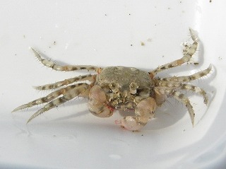 【左】タカノケフサイソガニ 【中】子供を抱いたタカノケフサイソガニ 【右】ユビナガホンヤドカリ