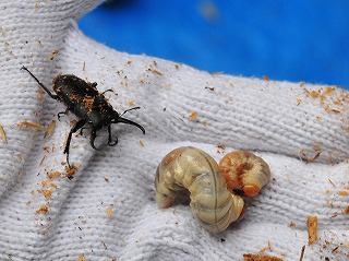 神社の朽ち木:昆虫:コクワガタ幼虫、ヨツコブゴミムシダマシ成虫、キマワリ幼虫、ヒゲジロハサミムシ成虫、幼虫