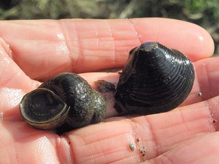 【左】ヒメタニシとシジミ         【中】イセノナミマイマイの赤ちゃん         【右】スクミリンゴガイ(ジャンボタニシ)の卵の抜け殻