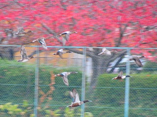 【左】一面、外来のアカウキクサがはびこっている。コガモ?       【中】ヒドリガモ       【右】カルガモ