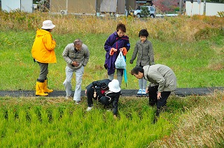 【左】子どもは鳴り物が大好きです           【中】水田の土手の生き物観察        【右】ミズワラビとイチョウウキゴケを見つけました