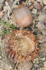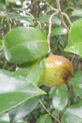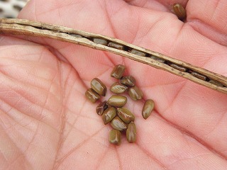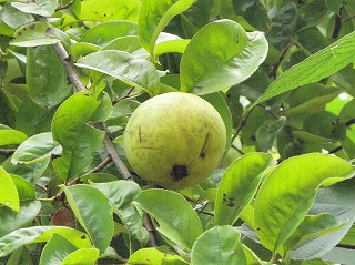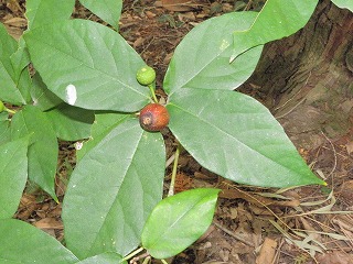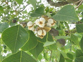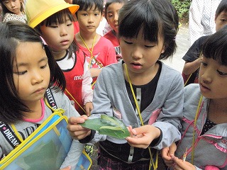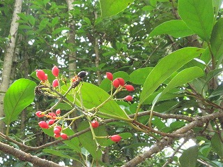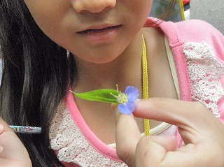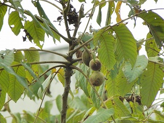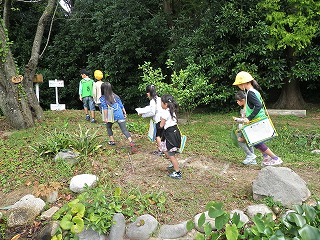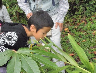 台風が去った後、気温が急激に下がり、曇り空のため観察会が始まる前までは肌寒い感じでした。いざ観察会が始まると生徒たちの活発な動きに誘われてちょうど適温になり、蚊の攻撃もなかったので、じっくりと観察できました。  校舎の昇降口に集合して講師紹介と諸注意などの後、5班に分かれてそれぞれの観察コースに向かいました。 黄土色の実のついているつる草の臭いを嗅いだ感想を聞くと「うんちの臭い」という回答に「ヘクソカズラ」と紹介すると笑いガはじけました。ヤイトバナという地方もあるとちょっぴり弁護しました。ハランの葉をぎざぎざに切ってどこかで見たことはありませんかと問いかけて、すしや弁当に使われているという回答を引き出し、昔はハランを使っていたことを話しました。残った葉っぱを笛にしてならしてみました。トウカエデの実を放り投げて、くるくる回るのを観察したり、シャリンバイの実やイヌビワの実をナイフで切って中を調べたりしました。ブラジルヤシの実を煉瓦で叩いて割り、中身を調べました。茶色の種が入っていました。他にはゲッケイジュやクスノキの葉っぱの臭いを嗅いだり、エンジュの実の皮をむいて小さなインゲンマメのような種取り出したりました。観察というより実験のような観察会になりました。(記 大野)