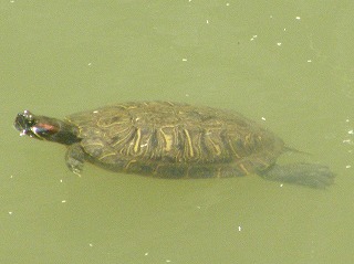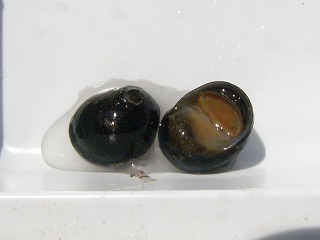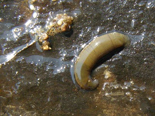 【左】イシマキガイ            【中】イシビルの仲間           【右】アカミミガメ(外来)