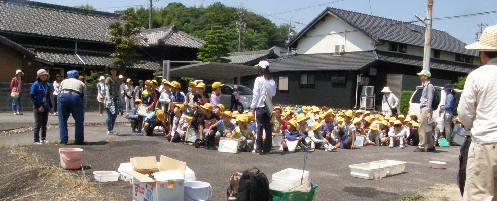 ・ 9:40〜10:15 児童と先生らは学校を出発し、学校西休耕田で虫探しや草遊びをしながら日長川へ向かう.