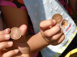 【左】お母さんたちも観察     【右】カタバミの葉で10円玉をみがく