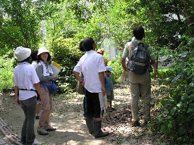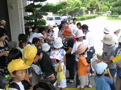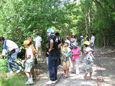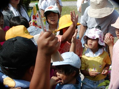 【右】「みてごらん、たくさんセミの抜け殻が木の葉に付いているよ」