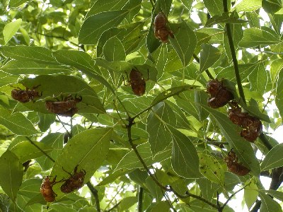 【左】こんなにたくさんアブラゼミの抜け殻が付いていました。