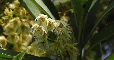 【左】ホルトの花です。美浜町の矢梨神社にホルトの県指定天然記念物があります。
