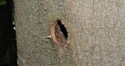 【右】アラカシに穴を空けたのはクマバチみたいです。